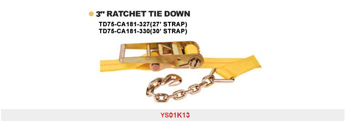 Ratchet & cam tie down 3` YS01K13 TD75-CA181-327(27` STRAP ) TD75-CA181-330(30` SRTAP) W.L.L:5400LBS/2454KGS BS:16200LBS/7363KGS PACKING:4 PCS/CTN G.W/N.W:28KGS/27KGS,1.4CUFT