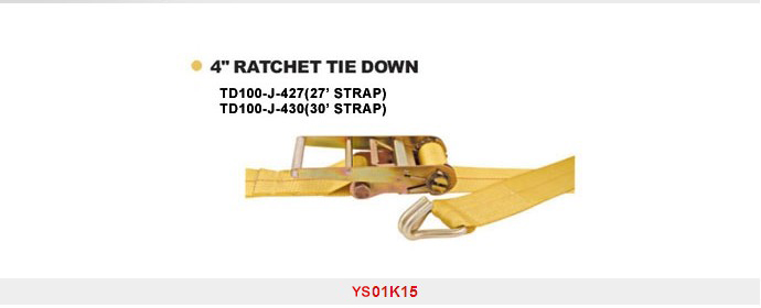 Ratchet & cam tie down 4`` YS01K15 4``RATCHET TIE DOWN TD100-J-427(27` STRAP ) TD100-J-430(30` SRTAP) W.L.L:6666LBS/3030KGS BS:20000LBS/9090KGS PACKING:4 PCS/CTN G.W/N.W:29KGS/28KGS,1. 5CUFT