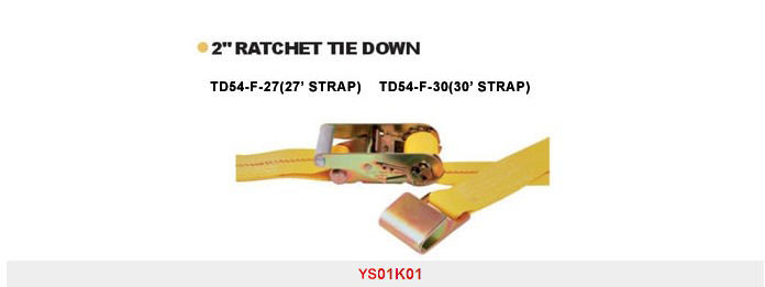 YS01K01 2``RATCHET TIE DOWN TD54-F-27(27` STRAP ) TD54-F-30(30` SRTAP) W.L.L:3333LBS/1515KGS BS:10000LBS/4545KGS PACKING:9 PCS/CTN G.W/N.W:26KGS/25KGS,1.3CUFT