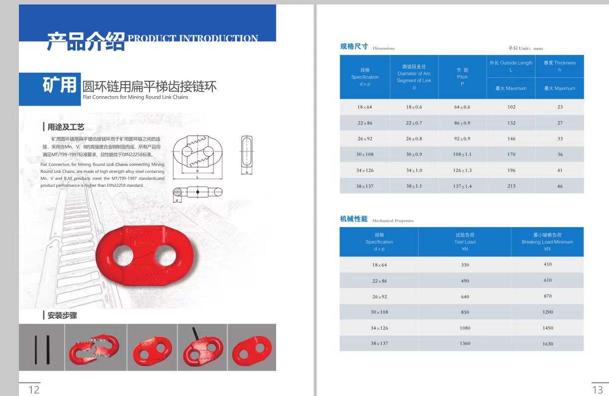 Flat Connectors for Mining Round Link Chains connecting MiningRound Link Chains, are made of high strength alloy steel containingMn,V and BAll products meet the MT/T99-1997 standards,andproduct performance is higher than DIN22258 standard.